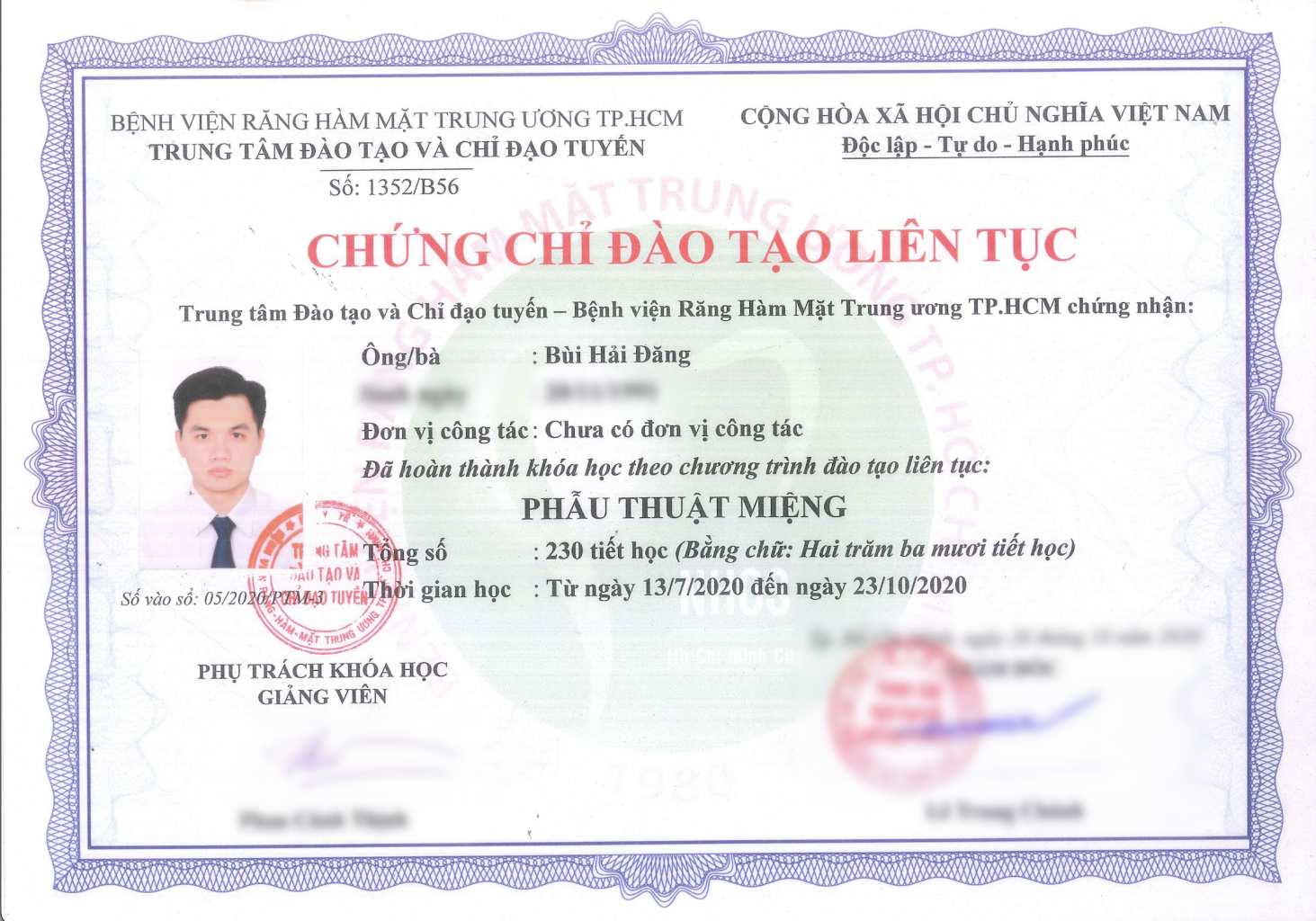 Giấy chứng chỉ đào tạo liên tục của Bác sĩ Bùi Hải Đăng về khoá học Phẫu thuật miệng.