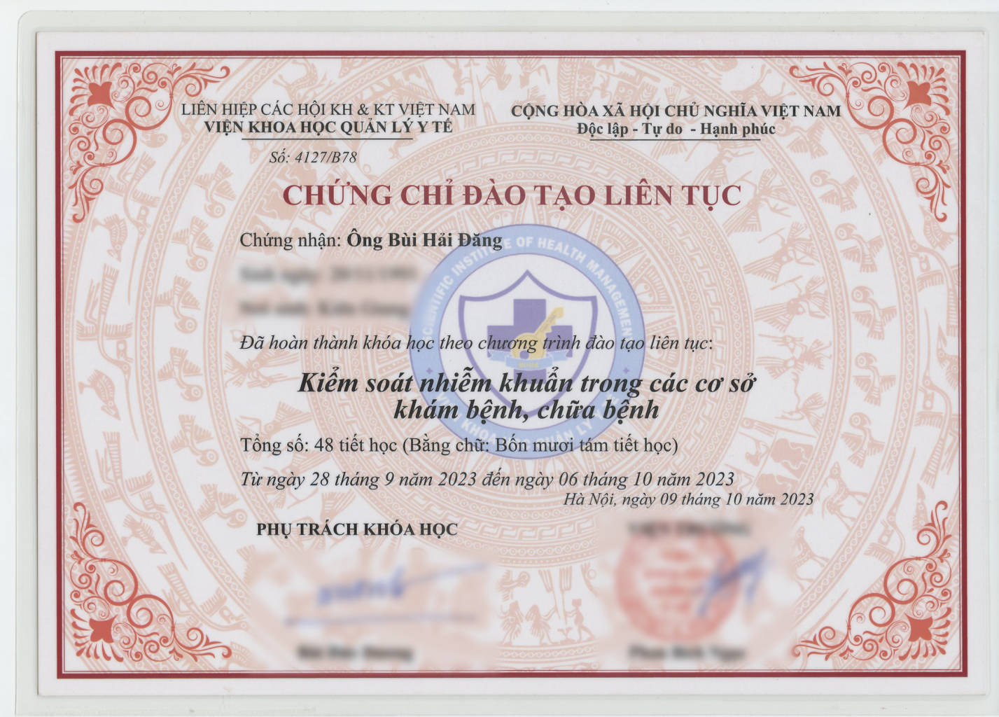 Giấy chứng chỉ đào tạo liên tục của Bác sĩ Bùi Hải Đăng về khoá học Kiểm soát nhiễm khuẩn trong các cơ sở khám bệnh, chữa bệnh.